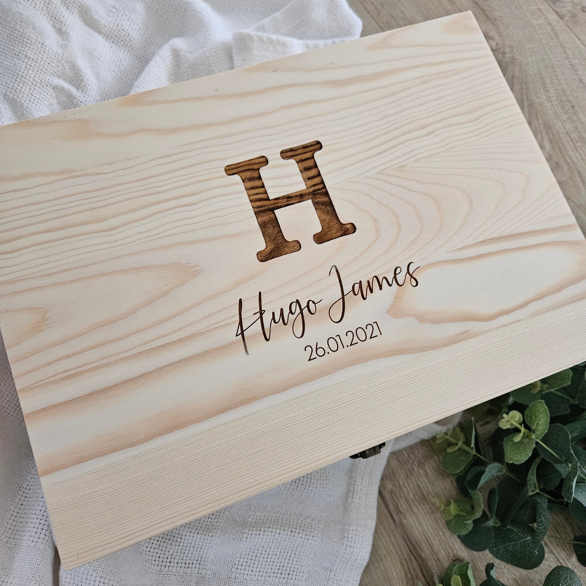 Our large solid pine personalised keepsake box is beautifully engraved with a bold initial, name and birth details — creating a timeless piece to treasure for years to come.