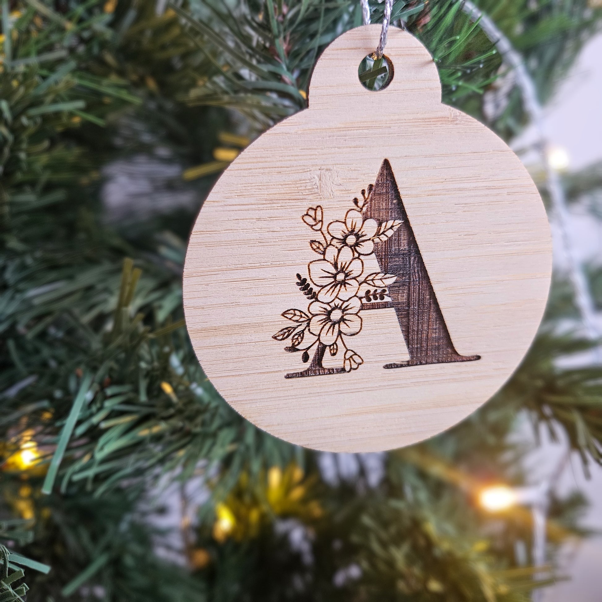 Engraved Bamboo Floral Monogram Bauble – Personalised Christmas Ornament