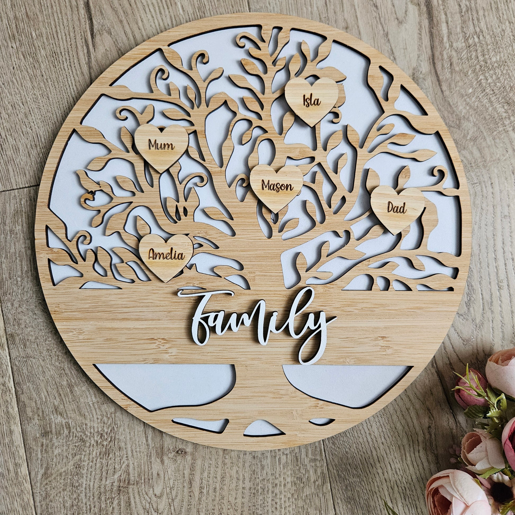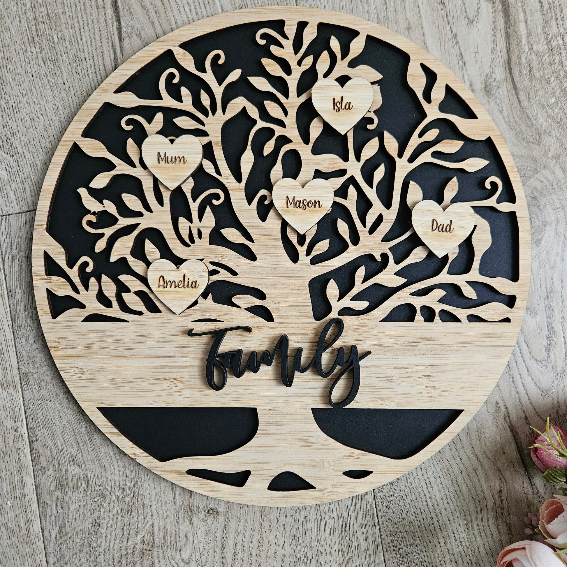 Celebrate your whānau with this beautifully crafted Personalised Family Tree Circle featuring heart-shaped name tags hanging from the branches. Made with three layers- The backing layer, the tree layer and the text and hearts layer this custom family tree is a meaningful piece of wall art that symbolises love, unity, and heritage.