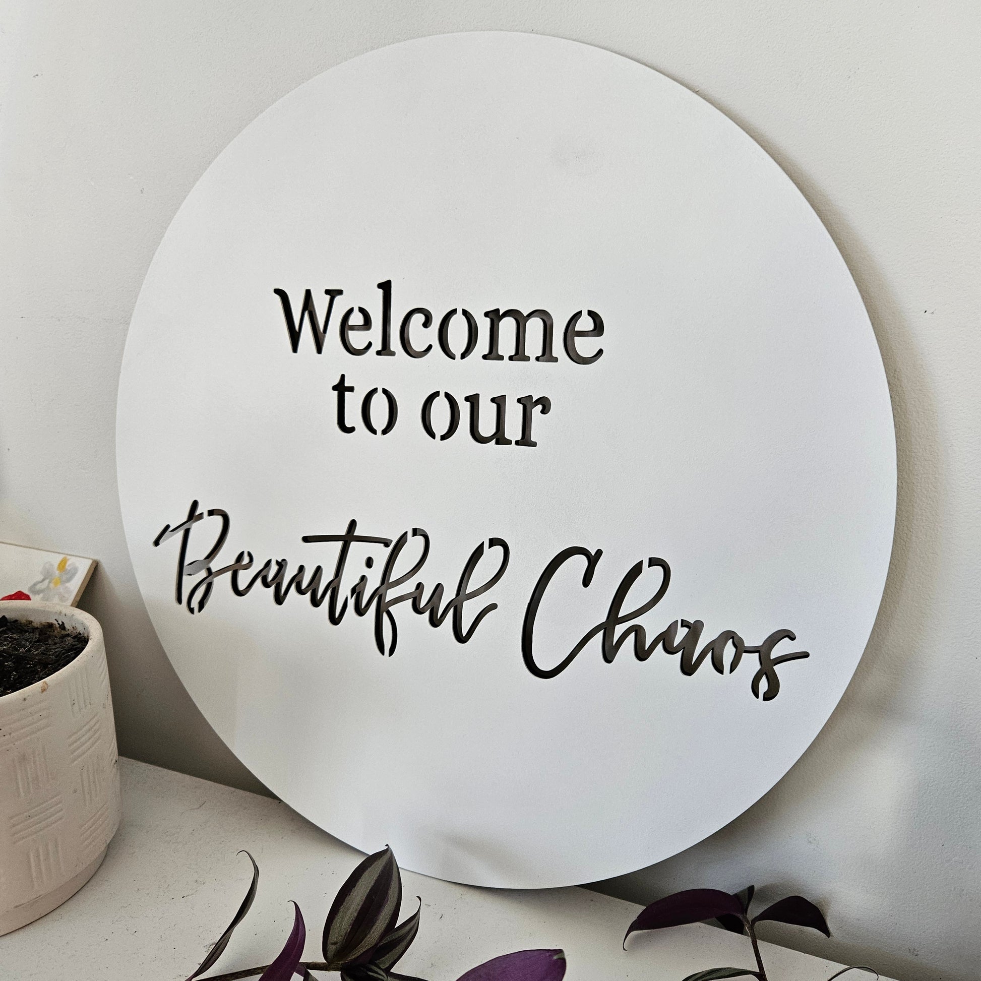 Embrace the perfectly imperfect moments of home life with our “Welcome to Our Beautiful Chaos” circular wall art sign. This modern statement piece celebrates family, laughter, and the joyful mess that makes every home unique.